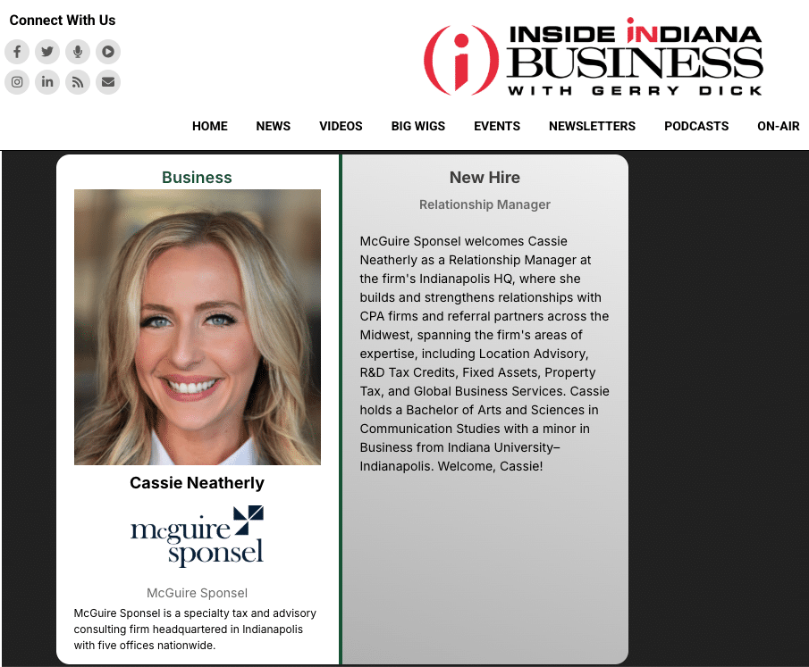 INDIANAPOLIS – McGuire Sponsel announced today that Cassie Neatherly has joined the firm as a Relationship Manager within its Alliance Network, further strengthening the firm’s commitment to supporting CPA firms and their clients through collaborative, relationship-driven service.